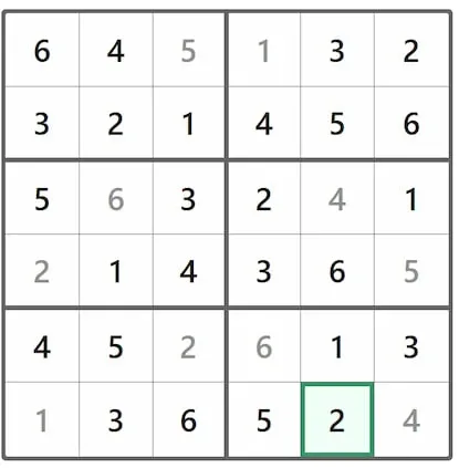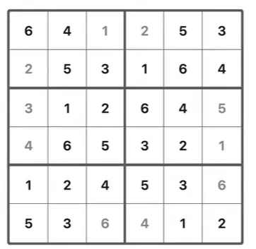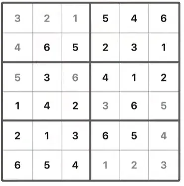 Fill the grid with numbers 1, 2, 3, 4, 5, and 6.
