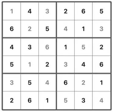 It’s a 6×6 grid, broken into six smaller 2×3 (or 3×2) shaded boxes.