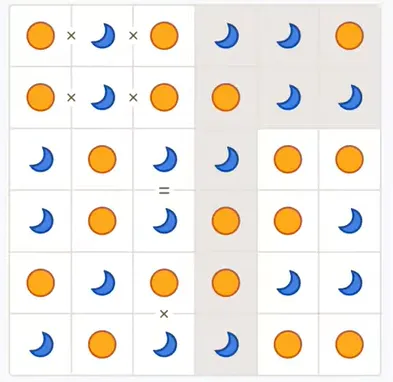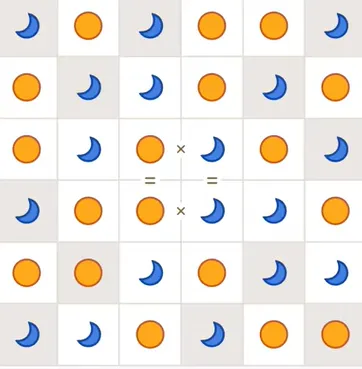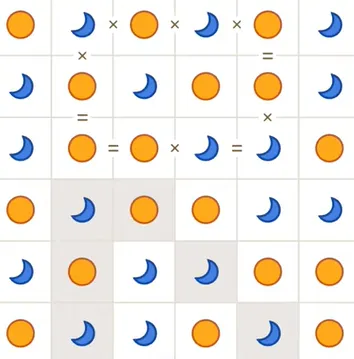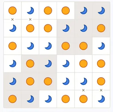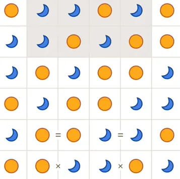 To play, tap cells to cycle sun/moon, use logic to deduce placements (e.g., if you see sun-sun, the next must be moon).