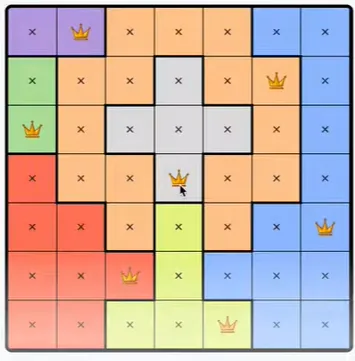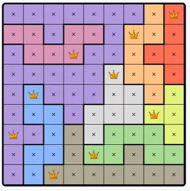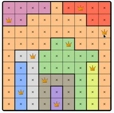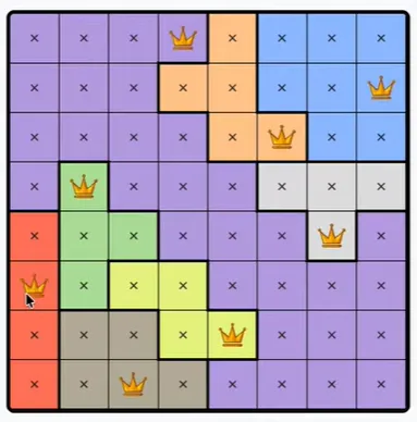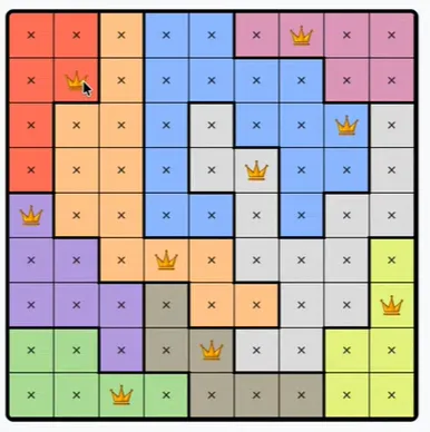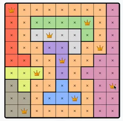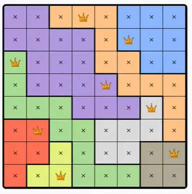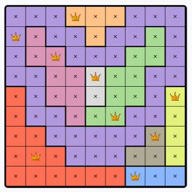 LinkedIn’s Queens is a daily logic puzzle where a row or column needs one queen, so if a region spans all possible squares of a row or column, a queen must be there and not in the rest of the region. There is only one correct answer, and there is no need to guess.