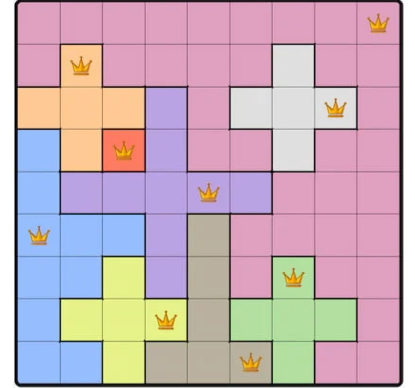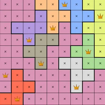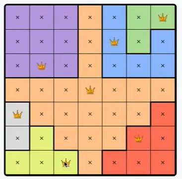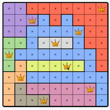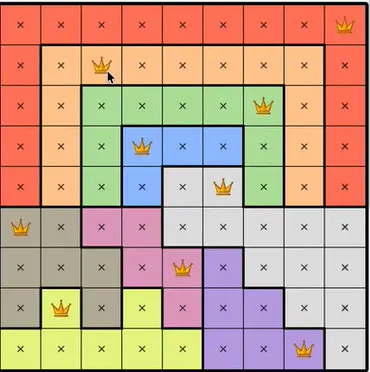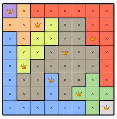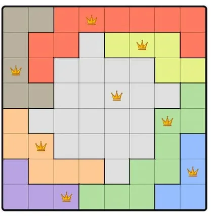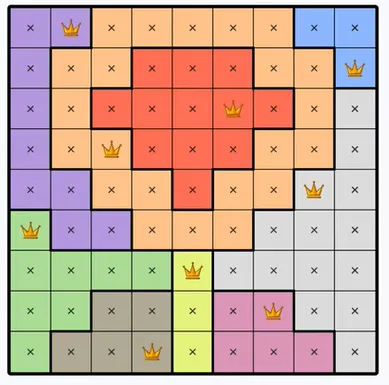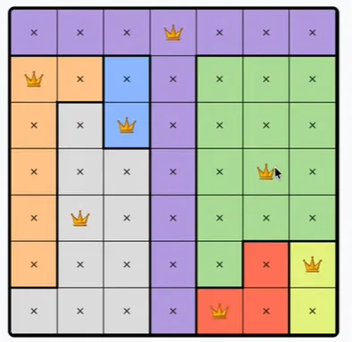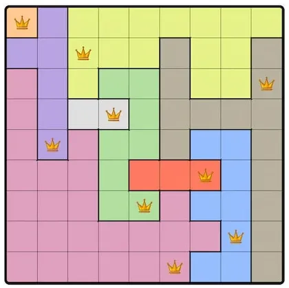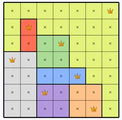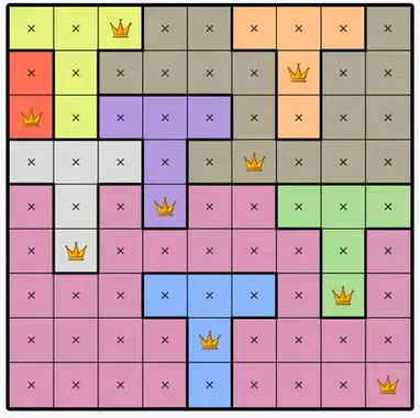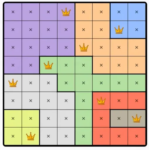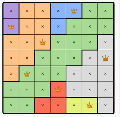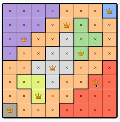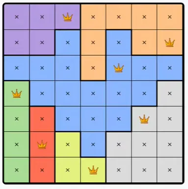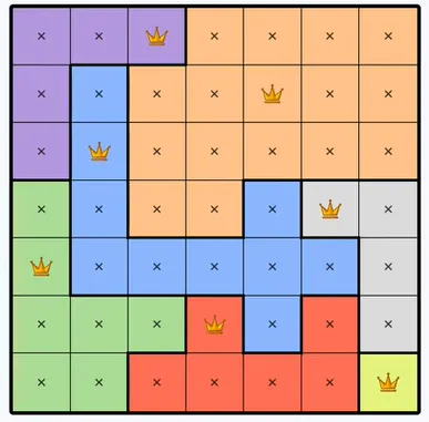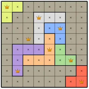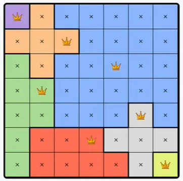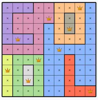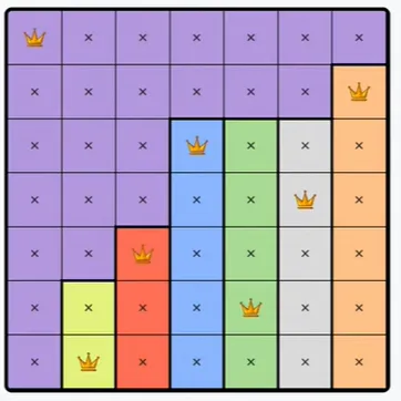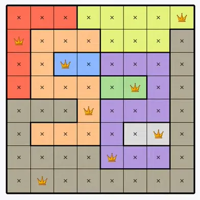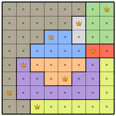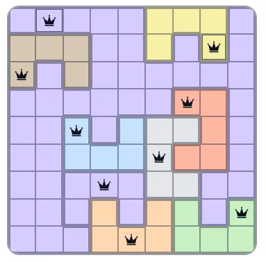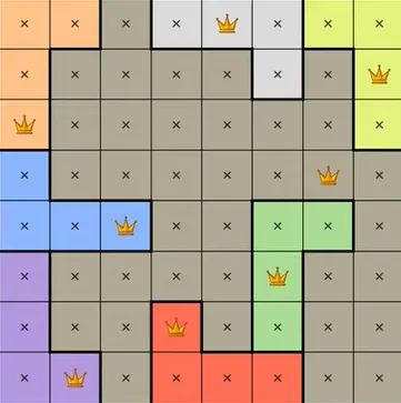 Each colored region can only contain one queen.